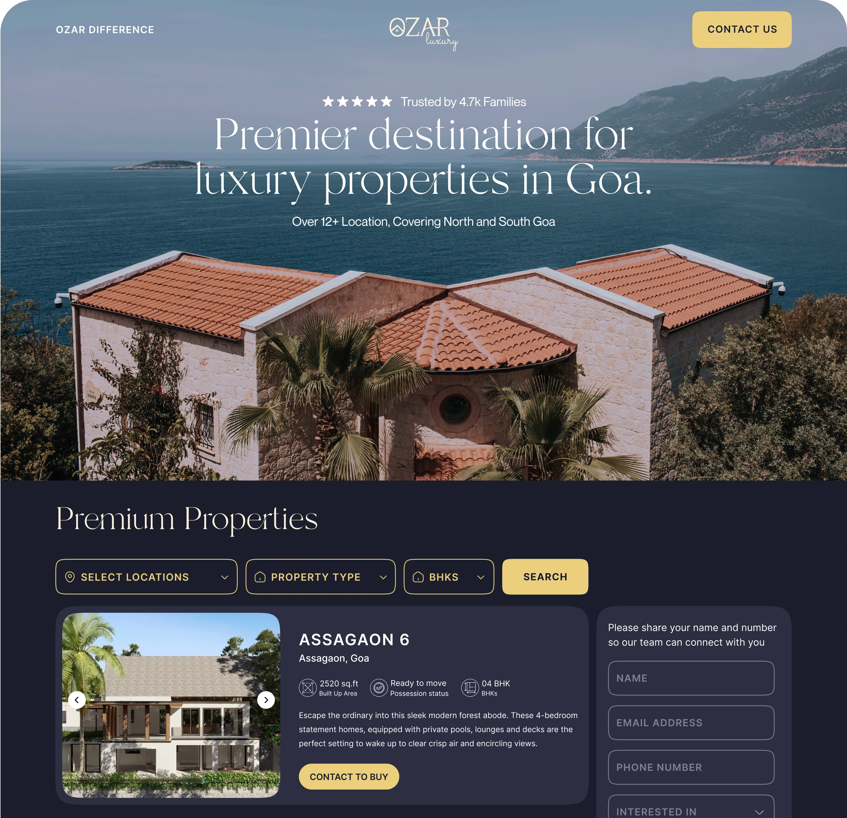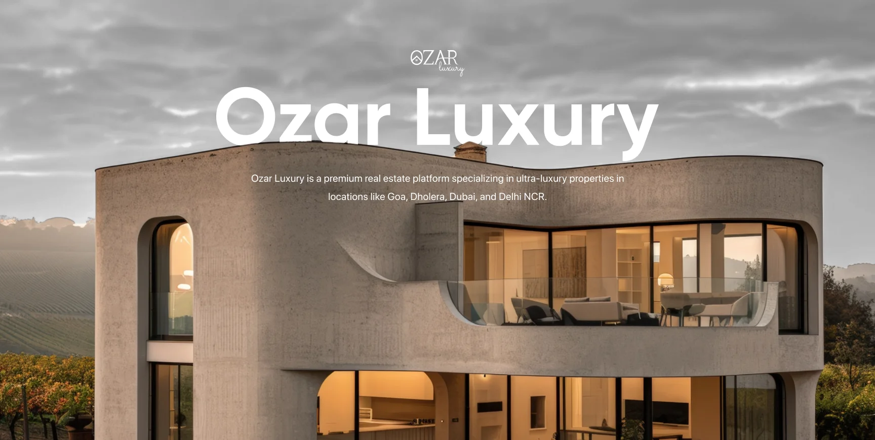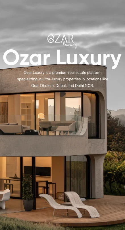 Ozar Luxury is a premium real estate platform specializing in ultra-luxury properties in locations like Goa, Dholera, Dubai, and Delhi NCR. It offers high-end apartments, villas, and exclusive homes with a focus on timeless elegance and legacy. The website highlights properties with detailed listings and includes client testimonials that emphasize trust and transparency.